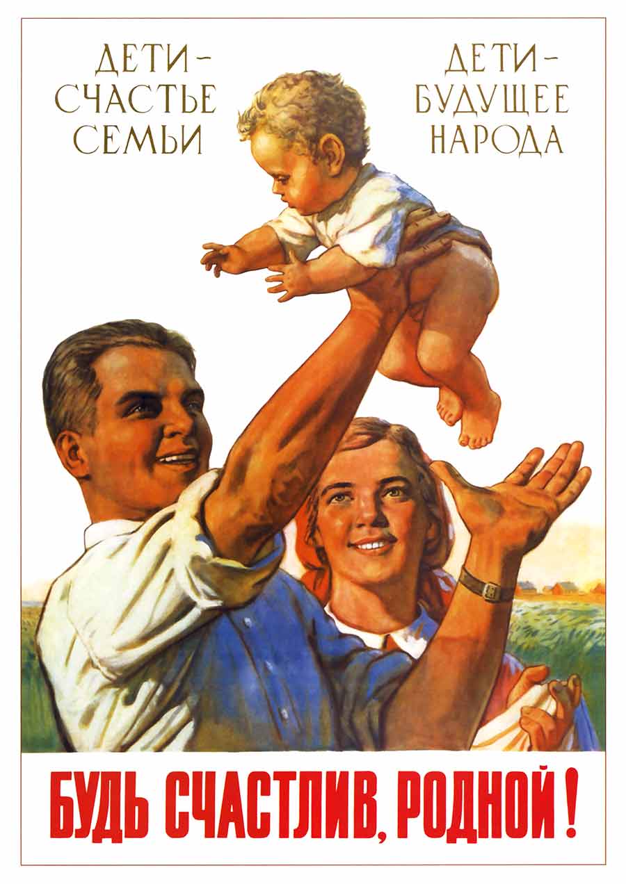 This Soviet poster was created in 1955 by V. Ivanov. The slogan reads “Children are the happiness of a family – Children are the future of the nation,” and the artwork shows a smiling young couple joyfully lifting their baby against a bright rural backdrop. The warm, painterly style emphasizes family, health, and optimism rather than avant-garde design, aligning the image with mid-1950s social-realist values. Produced as part of postwar campaigns to promote family welfare and population growth, the poster links private happiness to the nation’s future. It remains a clear example of popular Soviet poster art of the 1950s.