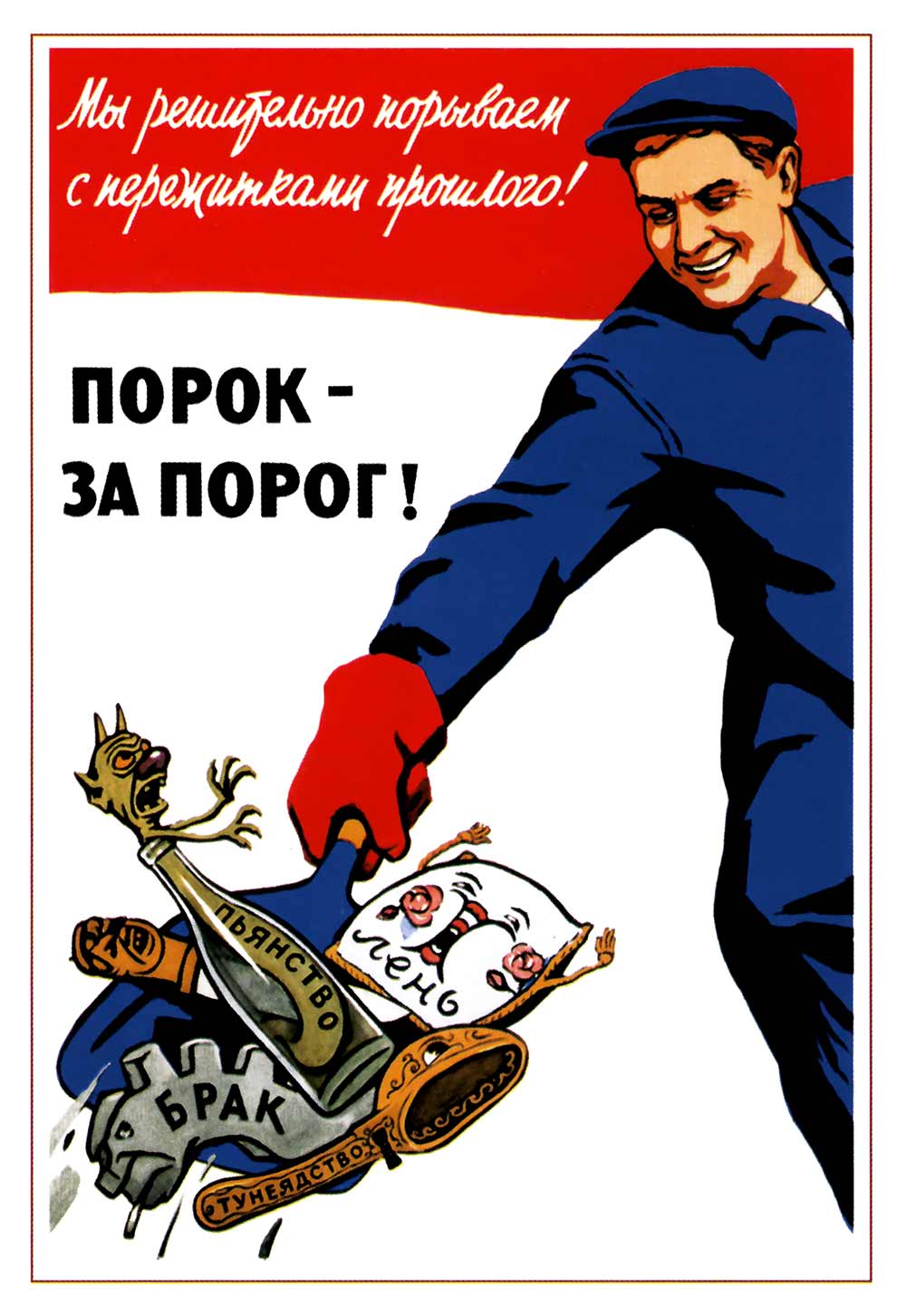 This Soviet propaganda poster carries the slogan “Порок – за порог!” (“Vice – out the door!”) and was created in 1959 by artist V. Govorkov. It reflects the campaign against social ills in the Khrushchev era, when the government promoted discipline, sobriety, and hard work as the foundations of socialist society. The poster shows a smiling worker in blue overalls sweeping away vices symbolized as grotesque caricatures: a bottle marked drunkenness, laziness (a lounging pillow), lies, poor workmanship (“Брак”), and parasitism (“Тунеядство”). Each vice is personified to look foolish and undesirable, reinforcing the moral message. The bold red and black text declares the Soviet determination to break with the remnants of the past and build a disciplined, productive future. Bright colors and dynamic composition make the message clear and memorable.