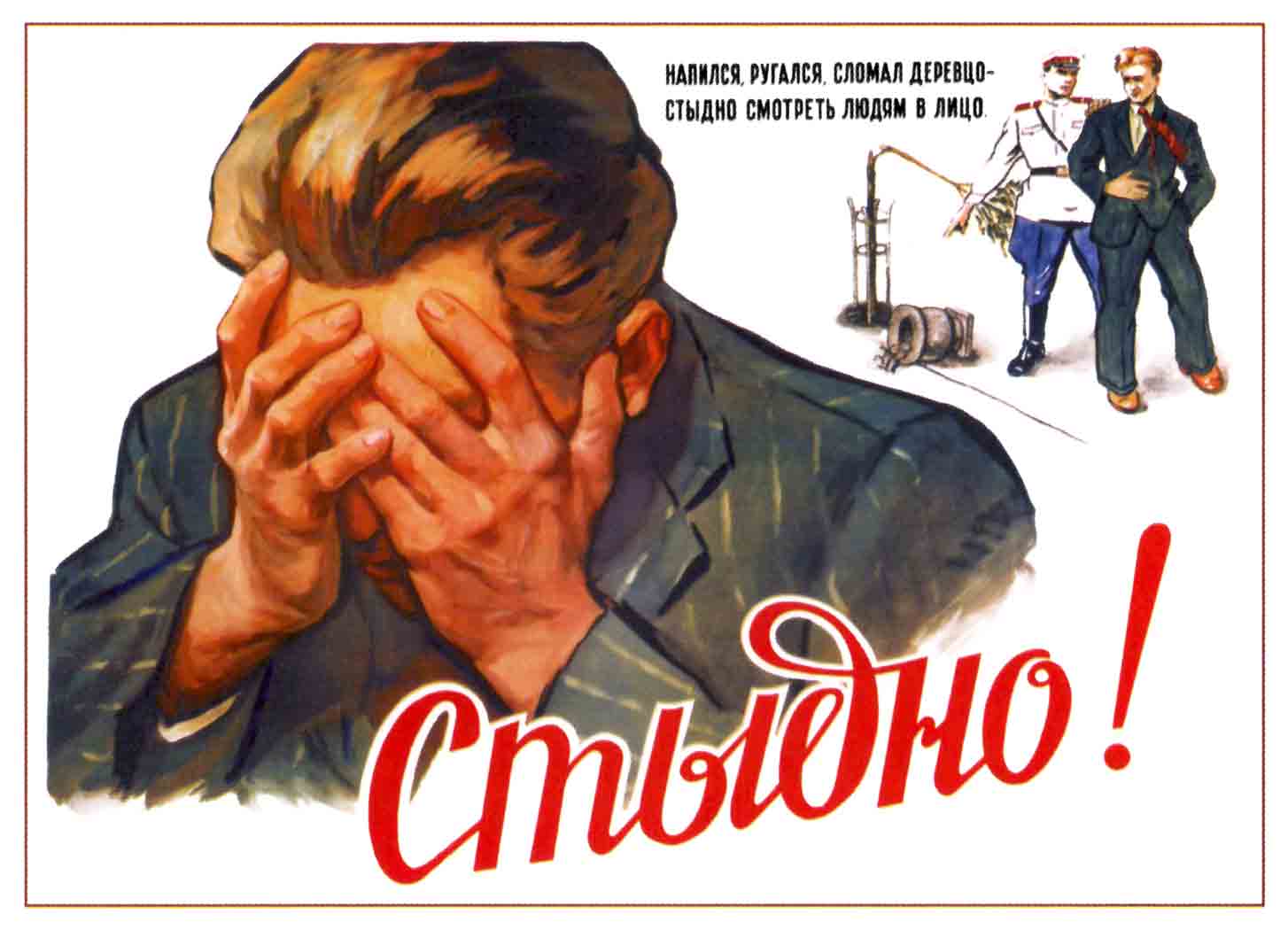 This Soviet propaganda poster, created in 1958 by N. Velezheva and N. Kuzovkin, is titled “Feeling Ashamed!” At the top, the words read: “Got drunk, cursed, broke a young tree – it’s shameful to look people in the face” (“Напился, ругался, сломал деревцо – стыдно смотреть людям в лицо”). The main image shows a man covering his face with his hands, overwhelmed by guilt and disgrace. To the right, two neatly dressed young men pass by, next to the broken sapling, symbolizing both social judgment and the consequences of careless behavior. The bold red slogan “Стыдно!” (“Shame!”) drives home the emotional impact of the poster. It reflects the Soviet Union’s efforts in the 1950s to encourage sobriety, responsibility, and respect for public property.