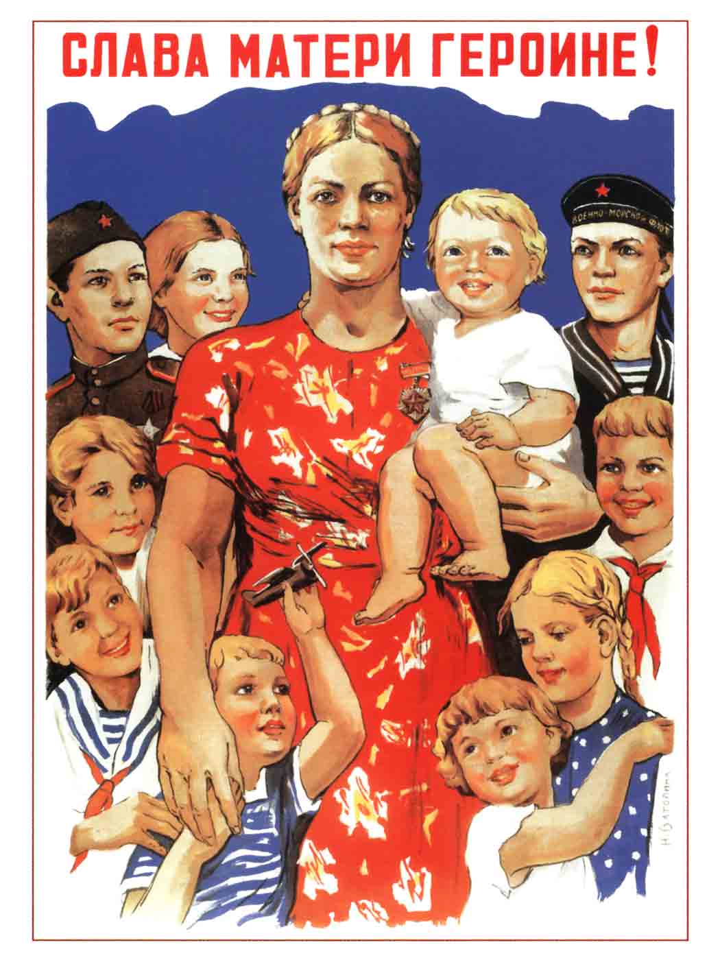 This Soviet poster is titled “Glory to the Mother-Heroine!” (Слава матери героине!) and was created in 1944 by Nina Nikolaevna Vatolina. It shows a dignified mother, wearing the Order of the Mother Heroine, surrounded by her many children, with figures in military and worker uniforms behind them-linking her maternal role to patriotic service. The visual style is optimistic and bold, with bright reds, whites, and blues emphasizing strength, hope, and Soviet ideals. This composition elevates motherhood from a private role into a public and honored duty, especially in wartime, and frames the large family as a contribution to the nation’s future.