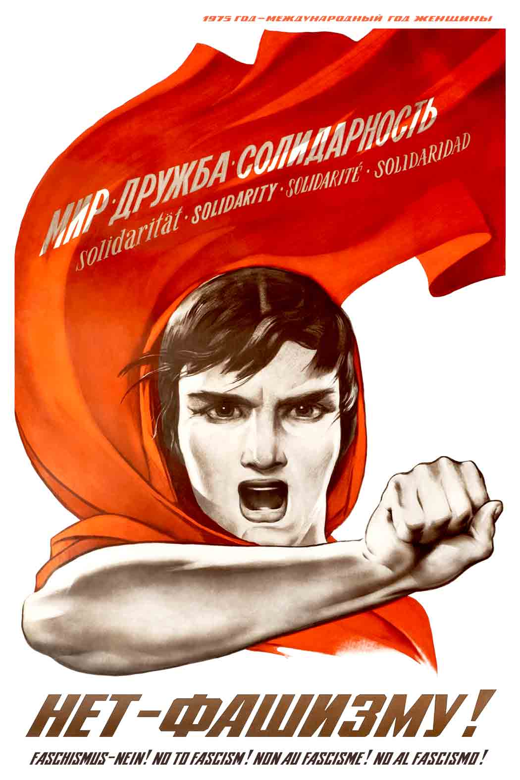 This Soviet propaganda poster was created in 1975 by artist Viktor Koretsky. It was issued during the International Year of Women as part of the USSR’s campaign to promote solidarity, peace, and resistance to fascism. The artwork depicts a determined woman with a flowing red banner behind her, carrying the slogan “Мир – Дружба – Солидарность” (Peace – Friendship – Solidarity) along with the bold declaration “Нет – фашизму!” (No to Fascism!). The striking imagery symbolizes unity, defiance, and the power of collective struggle. With its dynamic composition and powerful message, the poster became one of the widely recognized anti-fascist works of the Soviet era.