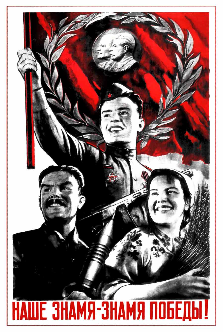 This Soviet World War II poster by Viktor Koretsky celebrates the triumph of the Red Army and the Soviet people in the Great Patriotic War. A smiling soldier proudly raises the red banner of victory, while beside him a worker holds artillery ammunition and a peasant woman presents wheat, symbolizing unity of the front line and the home front. Above them, framed in a laurel wreath, are portraits of Lenin and Stalin, representing ideological leadership and continuity of the revolution. The dynamic composition, dominated by red tones, conveys strength, optimism, and patriotic pride. The poster was created to inspire confidence and to mark the Soviet Union’s victory over Nazi Germany.