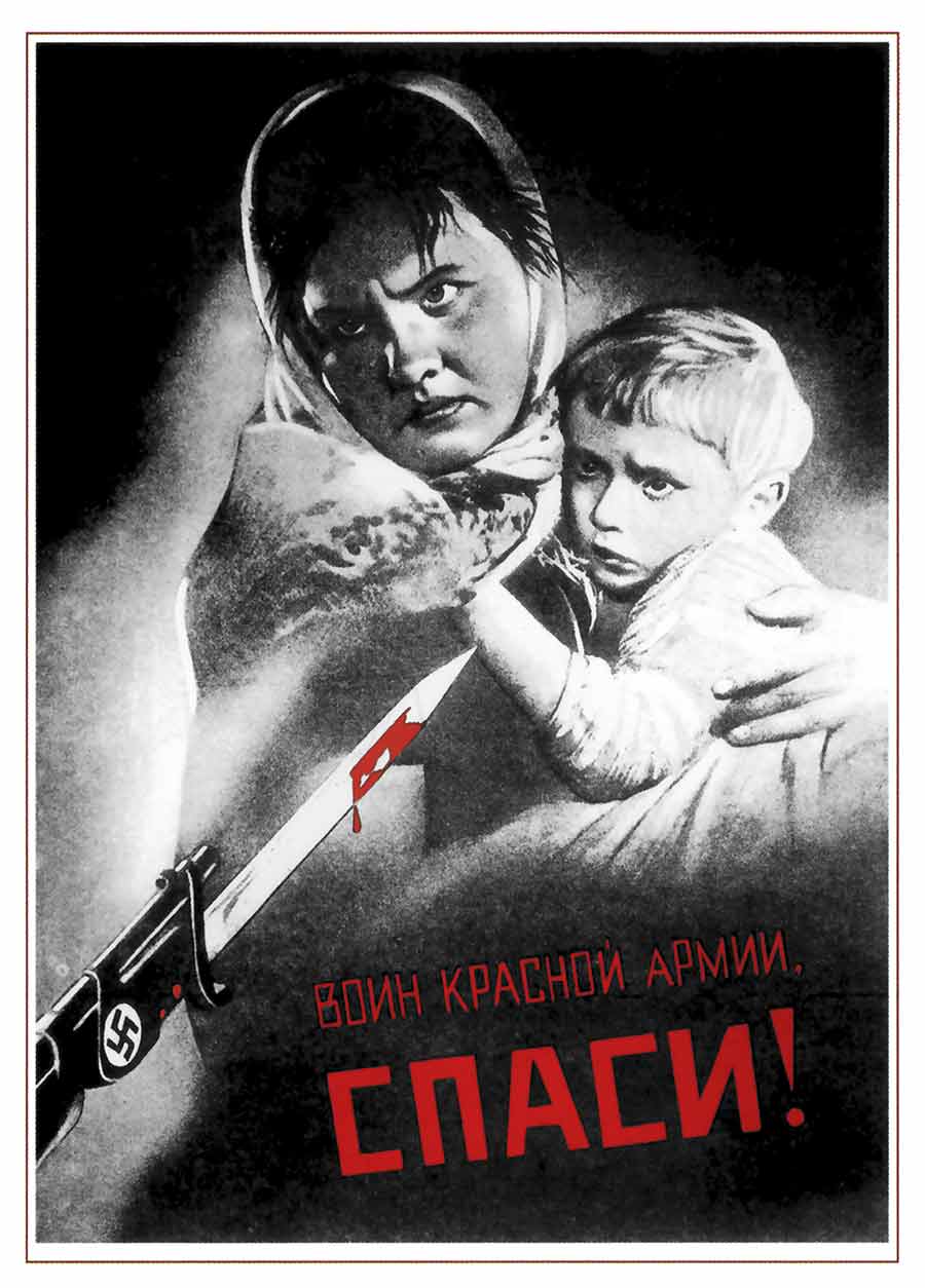 This Soviet World War II poster is titled “Red Army Soldier, Save Us!” («Воин Красной Армии, спаси!»). It was created in 1942 by artist Victor Koretsky, one of the most prominent Soviet poster artists of the period. The image shows a terrified woman holding her child while facing a bayonet marked with a Nazi swastika, symbolizing the threat of fascist invasion. The dramatic black-and-white tones with striking red lettering highlight fear, urgency, and a desperate call for help. Koretsky’s emotionally charged realism made his posters powerful tools of wartime propaganda. This poster became one of the most recognizable and moving appeals to Soviet soldiers during the Great Patriotic War