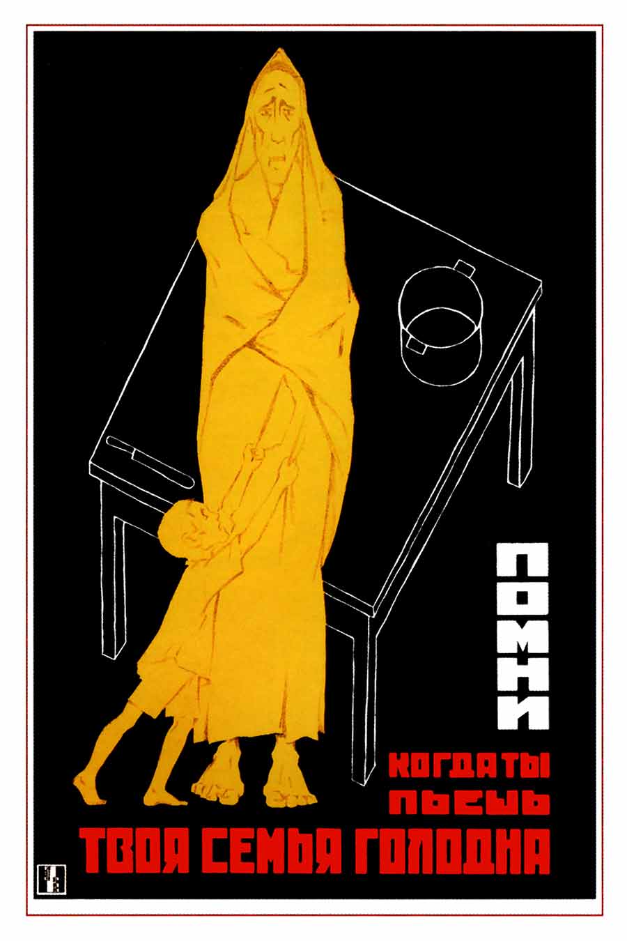 This Soviet anti-alcohol propaganda poster depicts a haunting image of a starving mother and child, drawn in stark yellow against a black background. The mother is shown wrapped in a cloak, looking weary and helpless, while the child tugs at her for support. They stand beside a bare table with only an empty pot, emphasizing deprivation and hunger. The design uses harsh contrasts and minimal color to highlight the seriousness of the message. The text in red and white warns the viewer to remember that drinking comes at the expense of their family’s well-being. This poster was part of a larger campaign in the USSR to combat alcoholism by linking it directly to poverty, hunger, and family suffering.