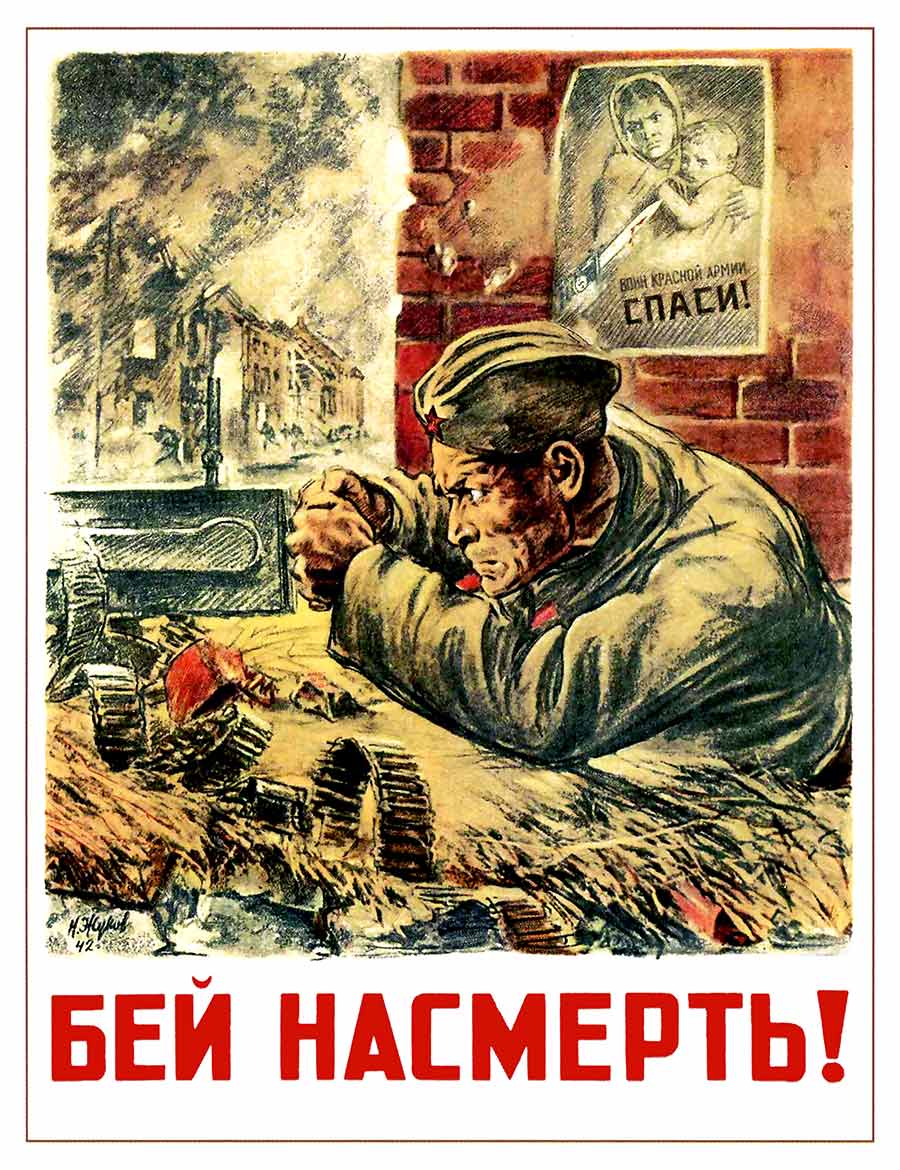 This Soviet propaganda poster from 1942, created by artist Nikolai Zhukov, was produced during the most brutal phase of the Eastern Front. It depicts a Red Army soldier in the ruins of a city, gripping his weapon with fierce determination as he fights against advancing German forces. A poster on the wall behind him shows a woman with the words “Воин красной Армии, спаси!” (“Warrior of the Red Army, save us!”), a reminder of the civilian population and homeland he is defending. The soldier’s grim expression and tense body capture the life-or-death struggle of Stalingrad and other urban battles. At the bottom, the slogan “Бей насмерть!” (“Shoot to kill!”) urges uncompromising resistance against the invaders. The poster embodies both patriotic duty and the call for total sacrifice in the fight for survival.