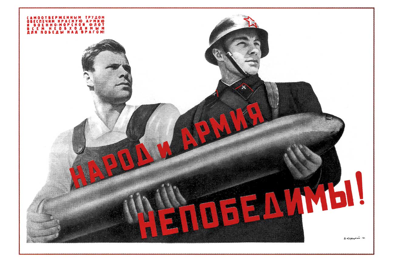 This Soviet World War II propaganda poster was created by Viktor Koretsky in 1941. It was produced during the early period of the Great Patriotic War to inspire unity between civilians and soldiers. The poster shows a factory worker and a Red Army soldier standing side by side, both holding a large artillery shell, symbolizing cooperation between labor and the military. The slogan in bold red letters reads: “The people and the army are invincible!” – Народ и Армия Непобедимы!. The text above calls on citizens to support the Red Army and Navy through self-sacrificing labor. The overall message emphasizes solidarity, strength, and patriotic duty in the struggle against the enemy.
