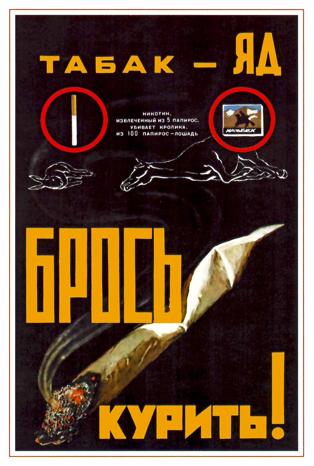 This powerful anti-smoking propaganda poster was created in 1957 by Soviet artist N. Ignatiev as part of a public health campaign in the USSR. The poster uses stark imagery and bold typography to communicate its urgent message: tobacco is deadly. At the top, it reads “Табак – Яд” (“Tobacco is Poison”), with a visual comparison showing that nicotine extracted from just 5 cigarettes can kill a horse, supported by illustrations of a cigarette and a dead horse. The center of the poster dramatically depicts a burning cigarette turning into the body of a collapsed horse – a vivid metaphor for tobacco’s lethality. In bold yellow and orange letters, the poster commands: Quit Smoking!